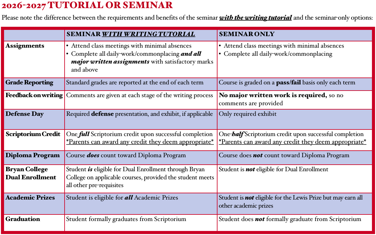 - SEMINAR WITH WRITING TUTORIAL – 2026-27 Tuition: $95 per student per month for 10 months, August through May